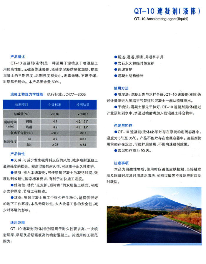 液體速凝劑是一種適用于濕噴及干噴混凝土用的高性能、無堿液體速凝劑、能使水泥凝結(jié)硬化加快、提高混凝土的早期強(qiáng)度,后期強(qiáng)度損失小,無毒無味,不燃不爆,對(duì)鋼筋無銹蝕。高性能速凝劑產(chǎn)品固含量50%。