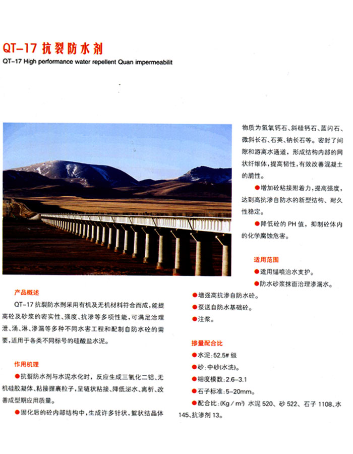 青海西寧橋通建材有限公司一家集減水劑、速凝劑、錨固劑、保塑劑、防腐劑、防水劑、膨脹劑、養(yǎng)護劑、混凝土外加劑及相關建材外加劑的研發(fā)、生產(chǎn)、銷售于一體的大型建材公司,位于西寧市城東團結(jié)橋,地理環(huán)境優(yōu)越,交通便利。多年來,公司一直致力于高分子化工、精細化工、無機化工域的技術研發(fā)與改進,擁有工程師和質(zhì)量監(jiān)控設備,相關產(chǎn)品已經(jīng)通過is09001質(zhì)量管理體系。公司秉承“行勝于言”的精神,堅持以持續(xù)的技術創(chuàng)新不斷地為客戶創(chuàng)造價值,產(chǎn)品及服務涵蓋國防、高鐵、冶金、電力、石化、煤礦、機械、建筑、鐵路等多個行業(yè)的工程建設領域。公司產(chǎn)品種類,以用戶要求為高目標,將產(chǎn)品于青海西寧、西藏拉薩、新疆烏魯木齊及各個地縣,贏得廣大客戶的支持與信賴!我們愿與客戶建立長期合作關系,咨詢電話:13897429995 18797387188,期盼新老客戶的精誠合作,共創(chuàng)明天的!